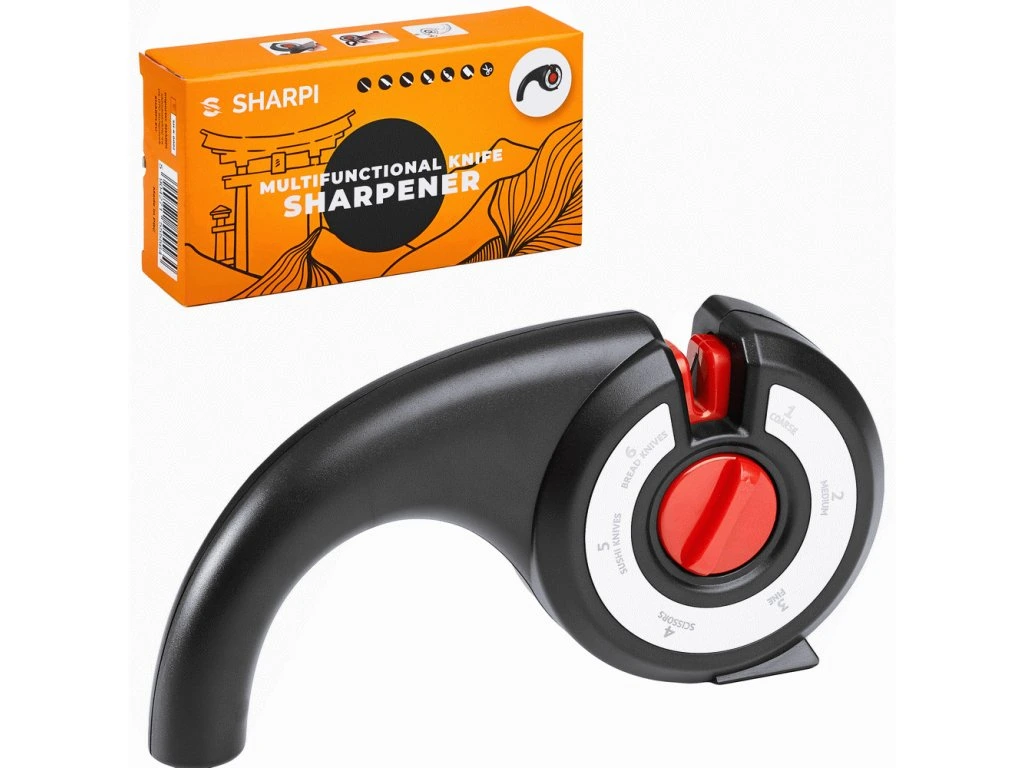 Ruční keramická kuchyňská bruska Sharpi představuje inovativní a zejména multifunkční novinku ze světa broušení. Brusku využijete na různé typy broušení, ať už potřebujete efektivně nabrousit kuchyňské nože, nože na chléb, nůžky, nože na sushi (yanagiba) nebo nože s jednostranným výbrusem. Stabilní, protiskluzová základna a ergonomická rukojeť zajišťuje bezpečnost a pohodlí při používání. Bruska je vyrobena z odolných materiálů – kombinace karbidu a keramiky zajišťuje dlouhotrvající výkon.