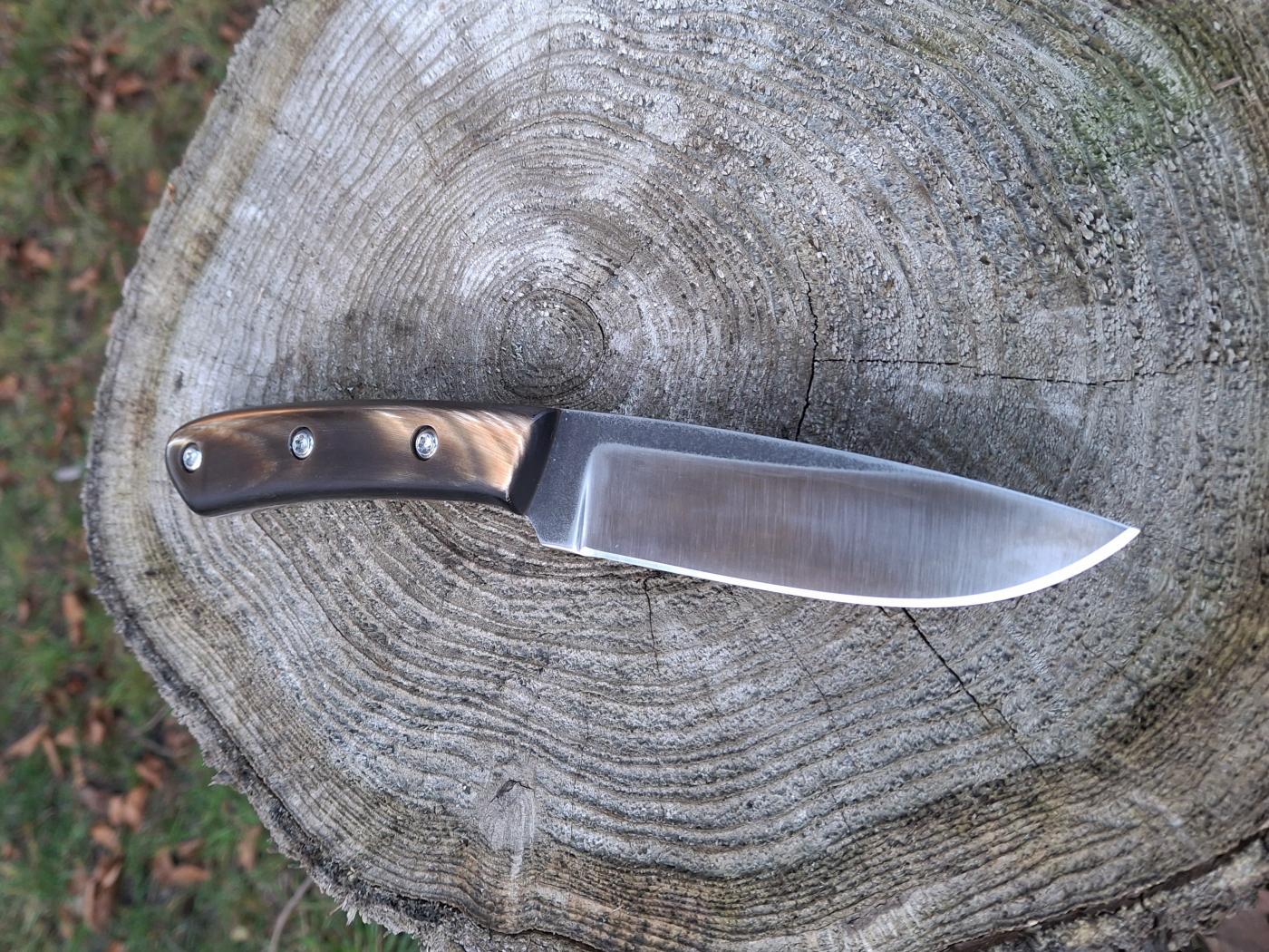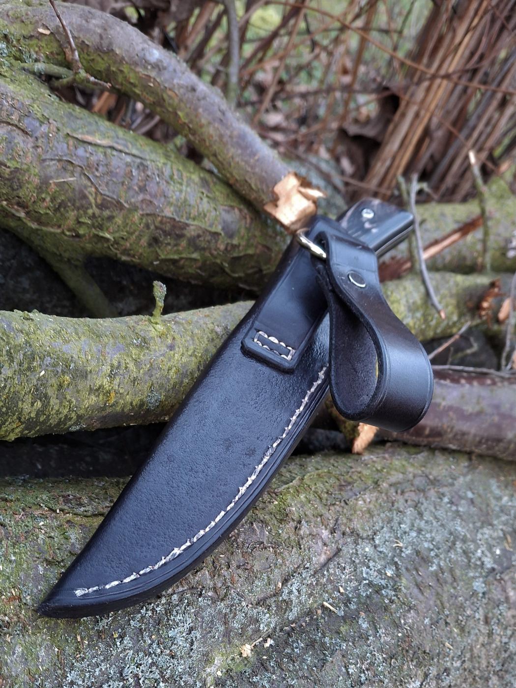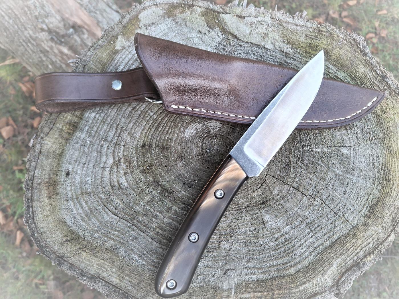 Robustní lovecký nůž ze švédské práškové oceli Elmax se střenkami z buvolího rohu. Kožené ručně šité pouzdro.