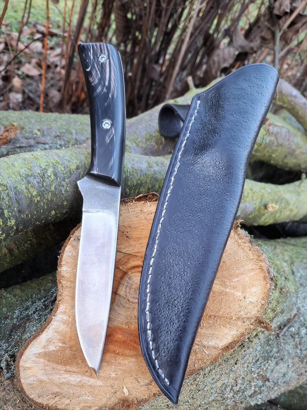 Robustní lovecký nůž ze švédské práškové oceli Elmax se střenkami z buvolího rohu. Kožené ručně šité pouzdro.