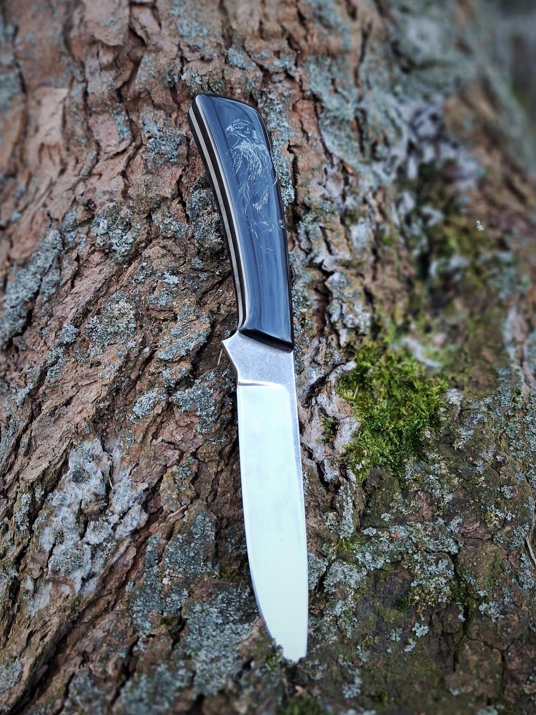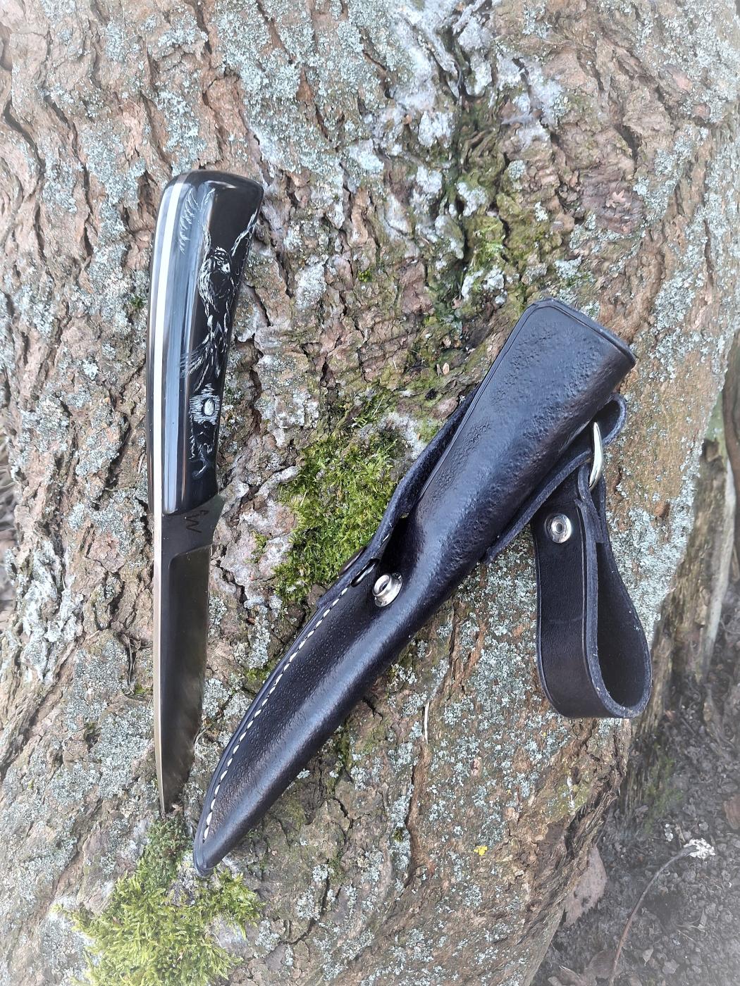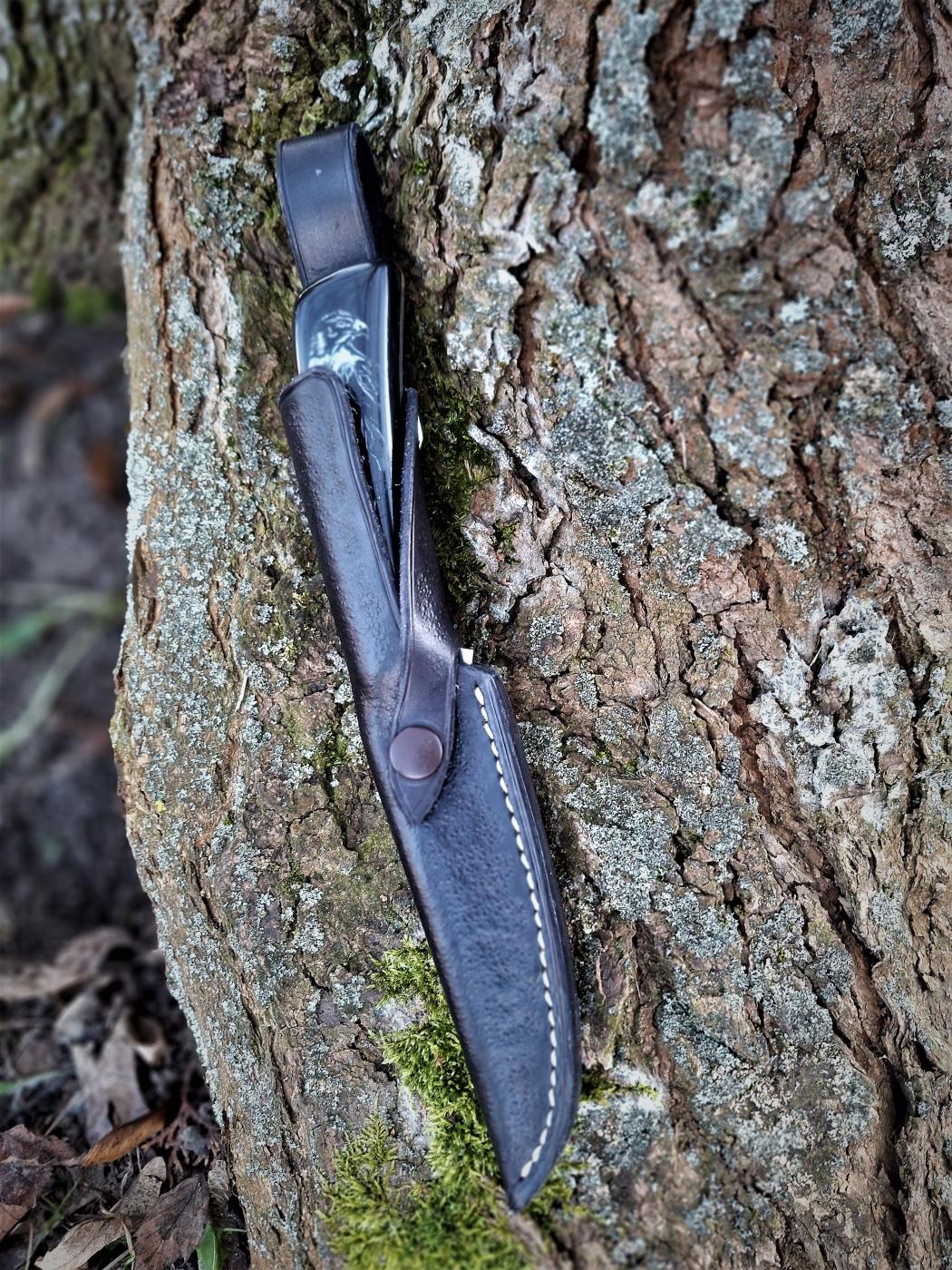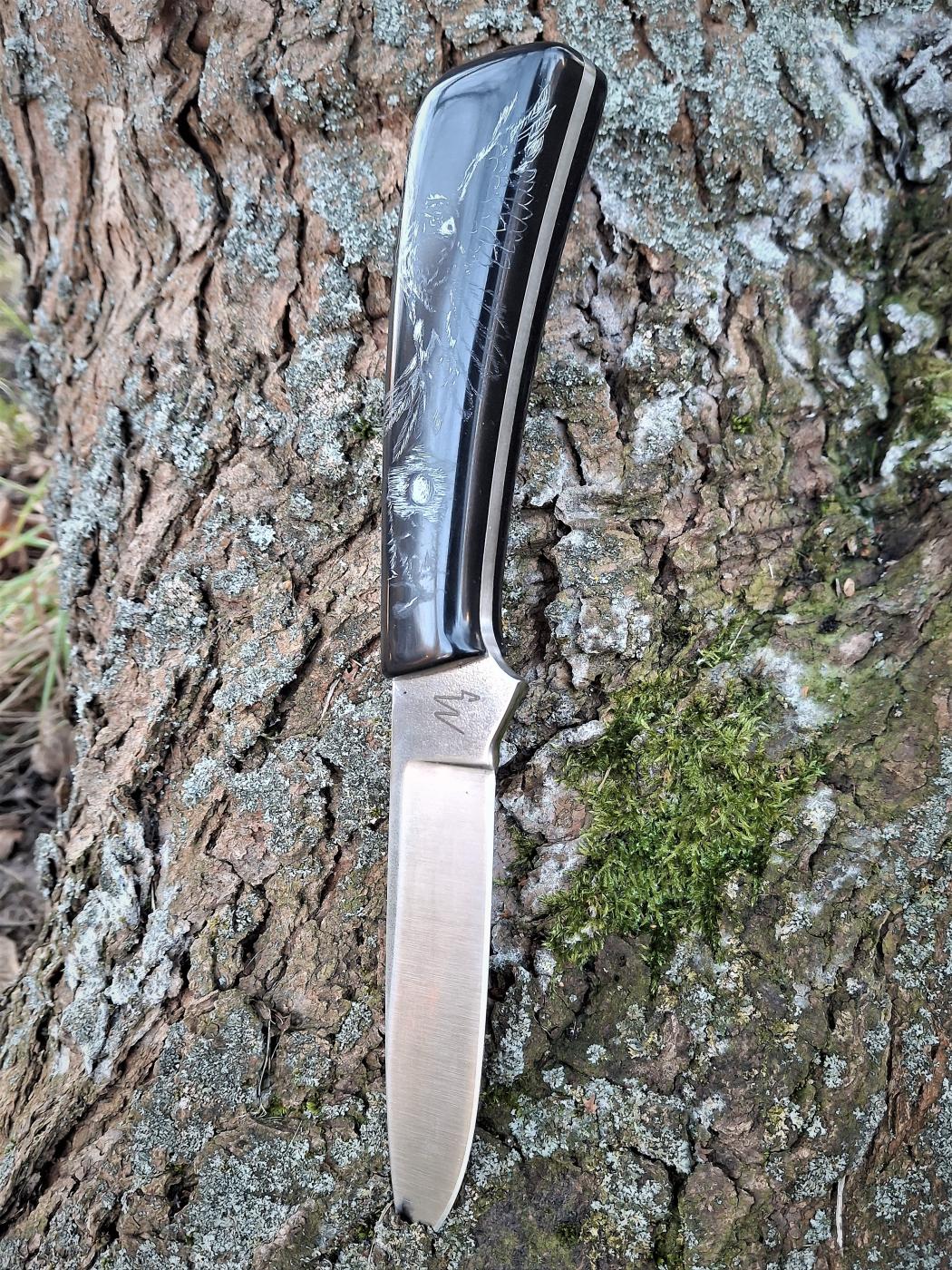 Robustní lovecký nůž ze švédské práškové oceli Elmax se střenkami z Corianu a zdobené metodou Scrimshaw (suchá jehla). Kožené ručně šité pouzdro.
