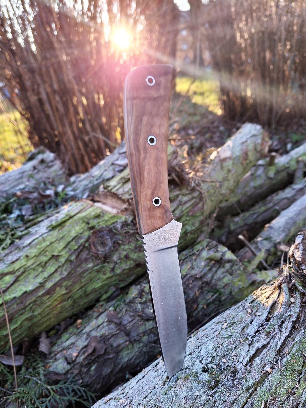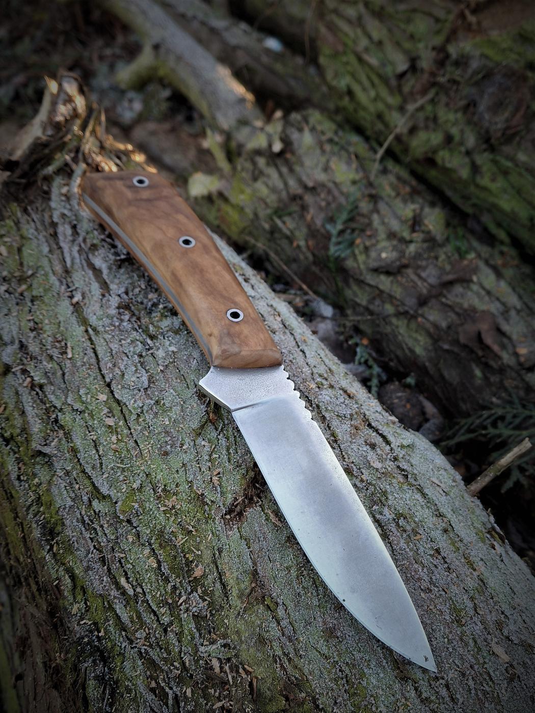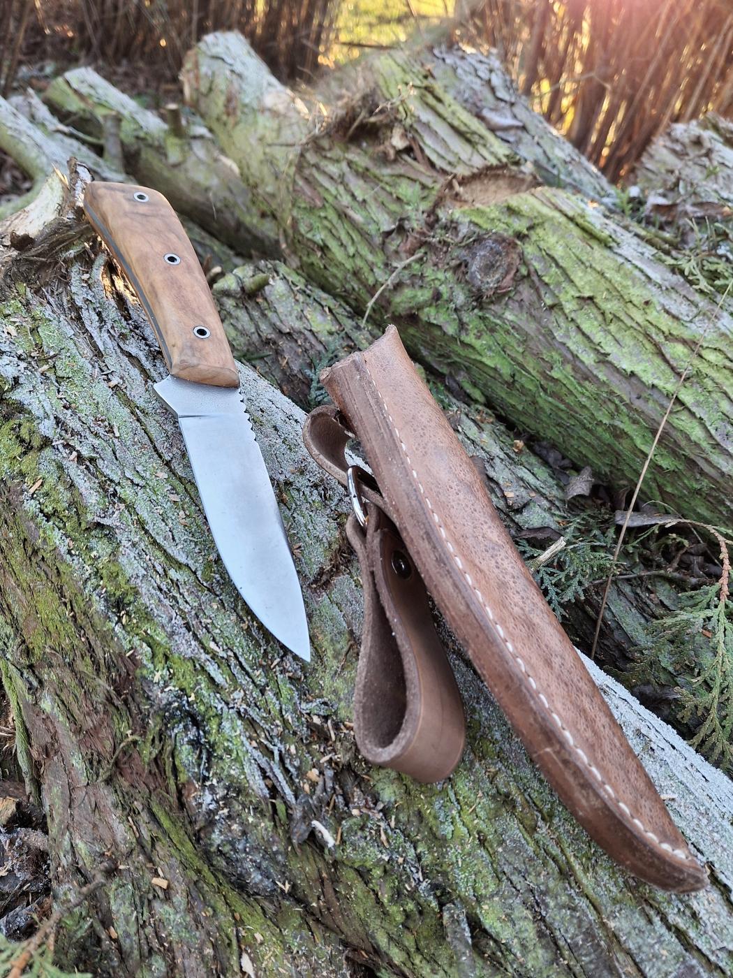 Lovecký univerzální nůž. Čepel N 690. Střenka stabilizovaný kaštan. Kožené ručně šité pouzdro.