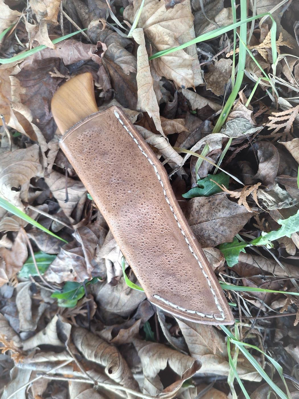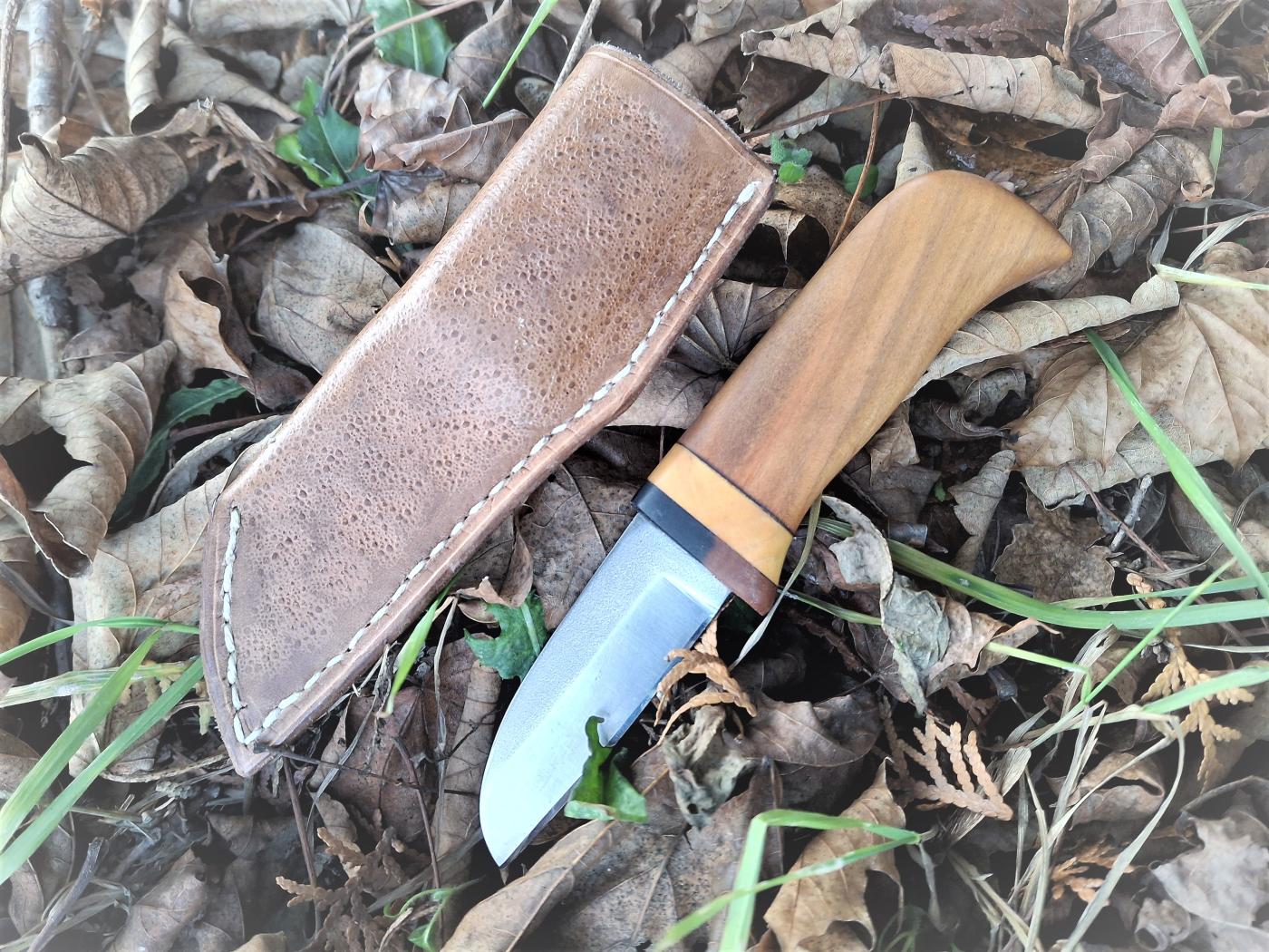 Malý a bezpečný nůž. Čepel N 690. Střenka třešeň, eben a stabilizovaná lípa Kožené ručně šité pouzdro. Jediný dětský nůž jaký jsem kdy vyrobili. Pouzdro nemá poutko.