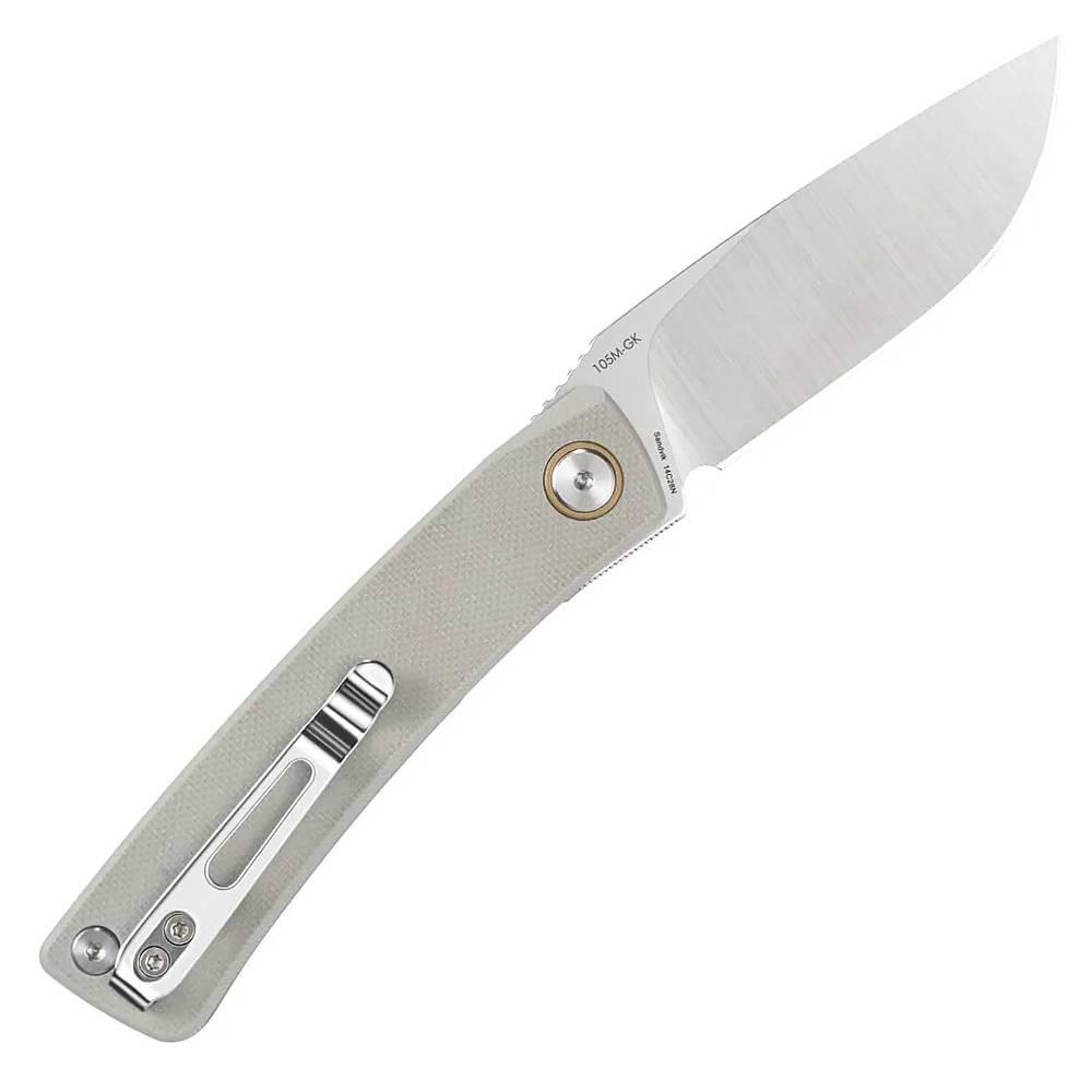 SRM 105M-GK, ocel Sandvik 14C28N, zámek Ambi-Lock, rukojeť z G10, barva světle šedá